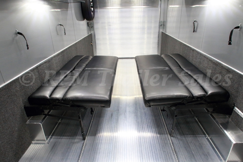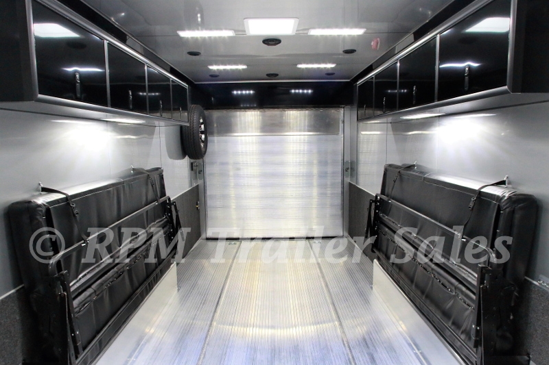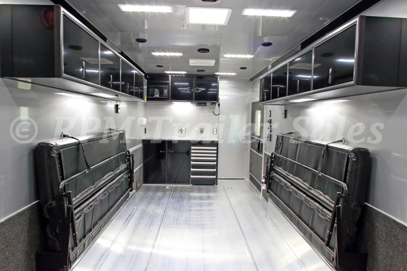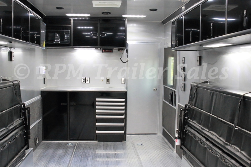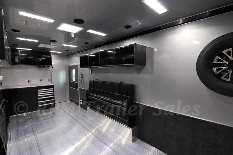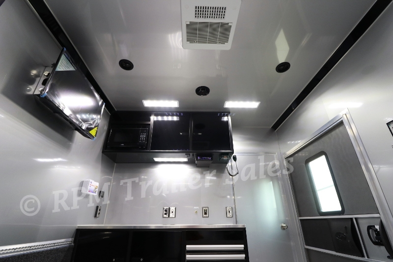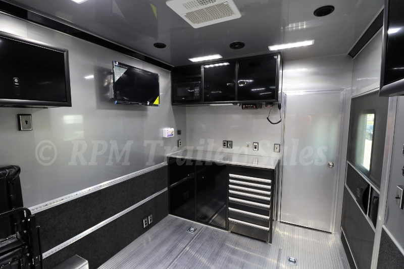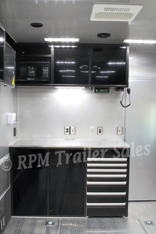 This 26’ custom aluminum trailer features a custom cabinet design that boast the gorgeous black aluminum cabinets with our black anodized cabinet trim, full bathroom, 7KW Onan Generator Package, plenty of seating and so much more. Dependability, unique design, and quality construction are the key elements of every trailer we design. Plus, we’ve got years of experience in designing work areas to match your work routine.