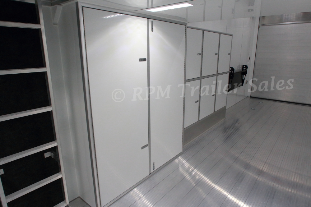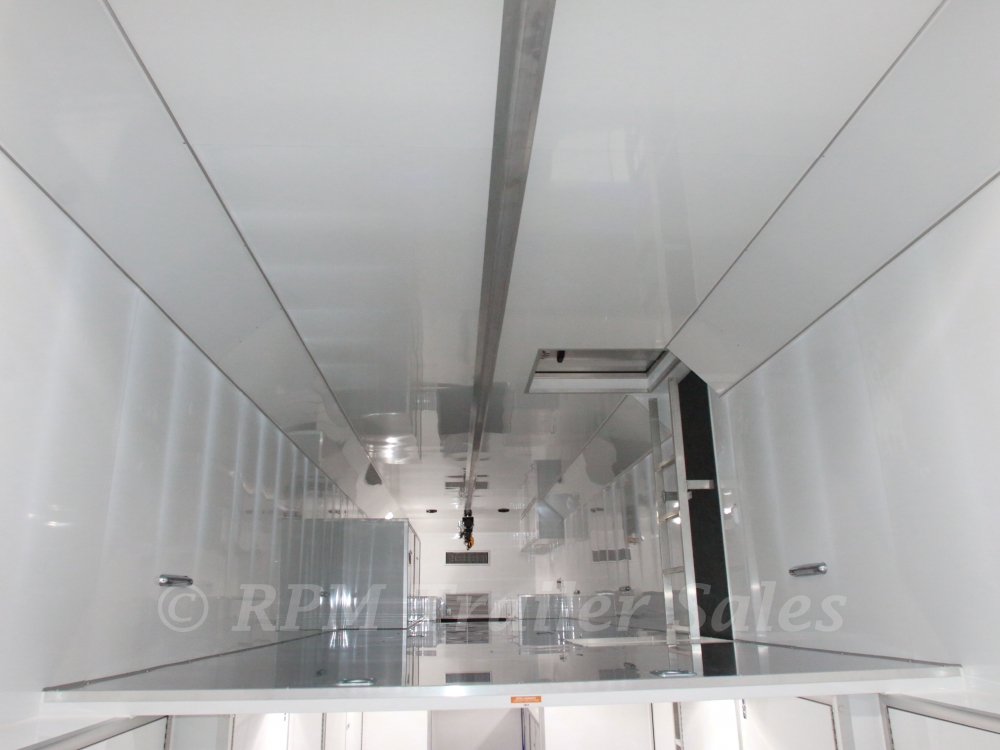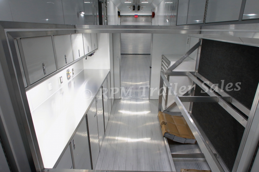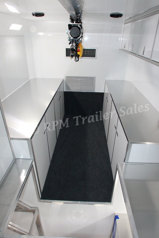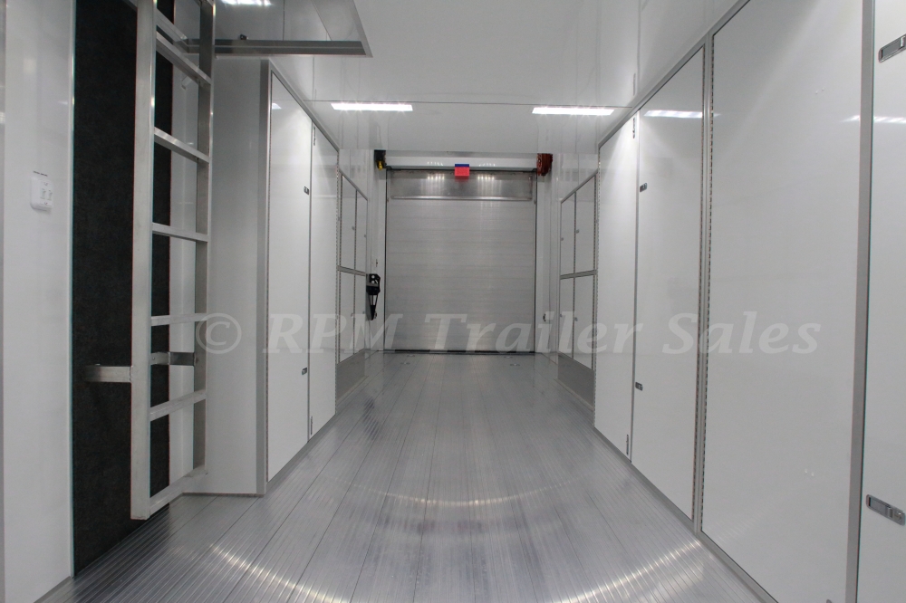 Unique and distinctive in every environment. Check out this ultimate 48’ gooseneck Sprint Car trailer design by RPM Trailer Sales. No matter the race set up RPM has you covered. This amazing sprint car trailer offers details on top of details. The exterior is built to max height and offers our .050 white exterior aluminum, triple 8,000 lb. axles, full heavy duty walk on roof, 97.5” rear ramp door opening and many more great options for one amazing Sprint car Hauler. The interior of this bad boy is set up for some serious racing. This trailer features our sprint car loading package, a spectacular attic, electric hoists and two electric cord reels to move the cars up into the attic and back out with ease. There’s tons of custom cabinets built into this unit for ample supply of storage, including motor storage, Sprint Car Sidewall Axle Storage Cabinet, custom tool chest, and fuel jug cabinets just to name a few. Let’s not forget the Bard AC unit with 5KW Heat.