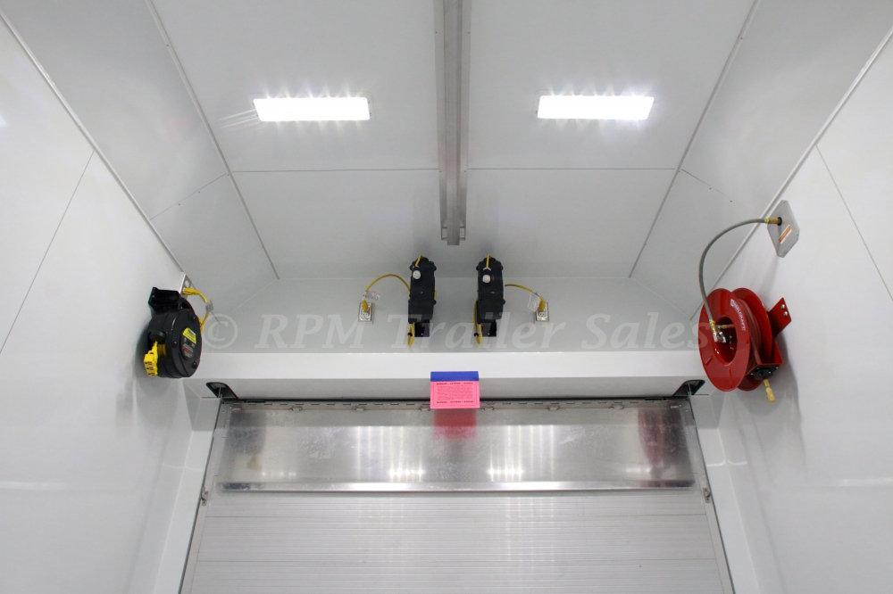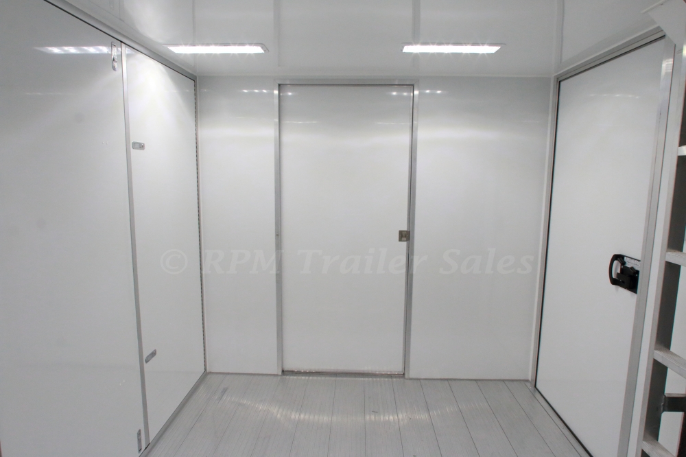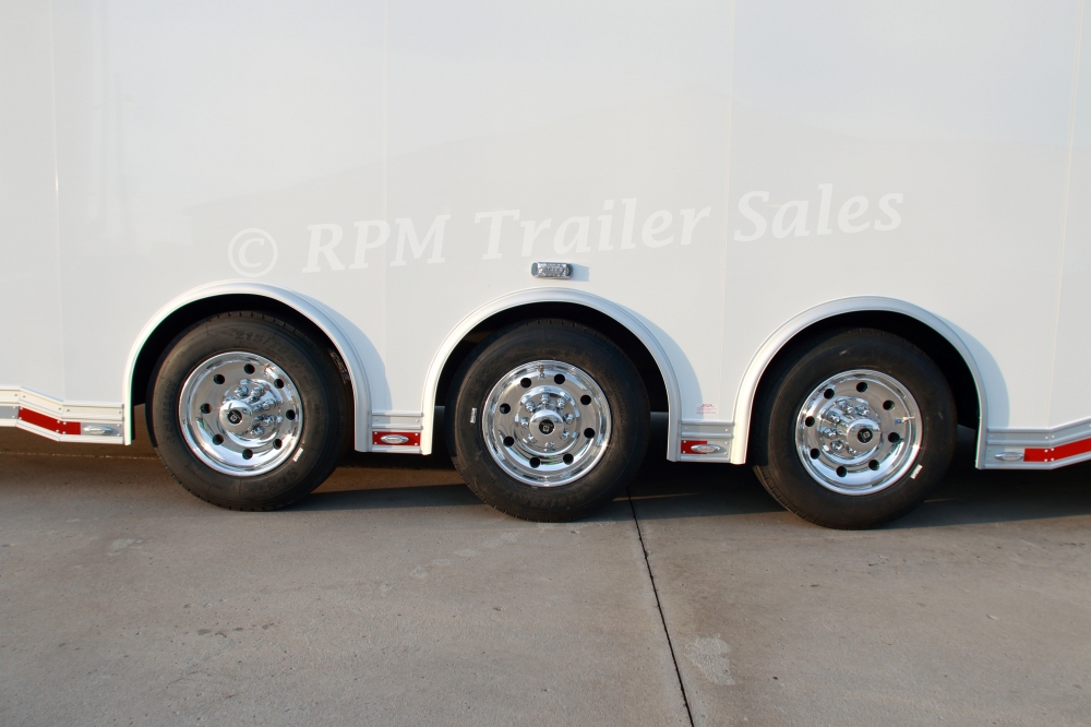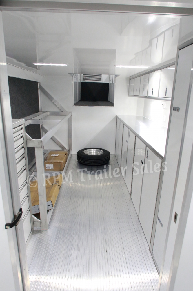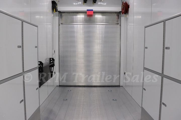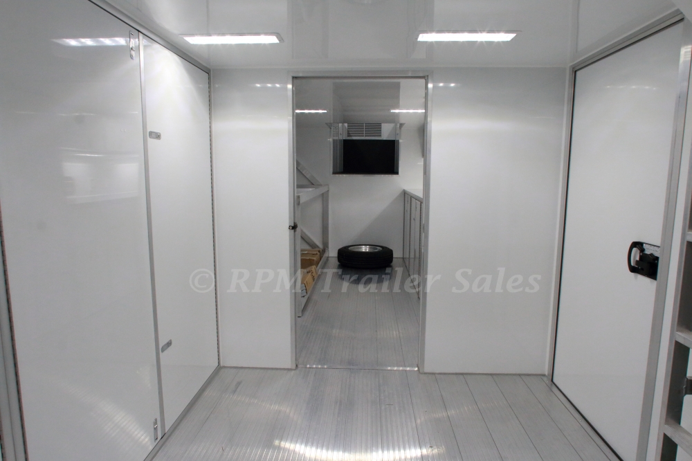 Unique and distinctive in every environment. Check out this ultimate 48’ gooseneck Sprint Car trailer design by RPM Trailer Sales. No matter the race set up RPM has you covered. This amazing sprint car trailer offers details on top of details. The exterior is built to max height and offers our .050 white exterior aluminum, triple 8,000 lb. axles, full heavy duty walk on roof, 97.5” rear ramp door opening and many more great options for one amazing Sprint car Hauler. The interior of this bad boy is set up for some serious racing. This trailer features our sprint car loading package, a spectacular attic, electric hoists and two electric cord reels to move the cars up into the attic and back out with ease. There’s tons of custom cabinets built into this unit for ample supply of storage, including motor storage, Sprint Car Sidewall Axle Storage Cabinet, custom tool chest, and fuel jug cabinets just to name a few. Let’s not forget the Bard AC unit with 5KW Heat.