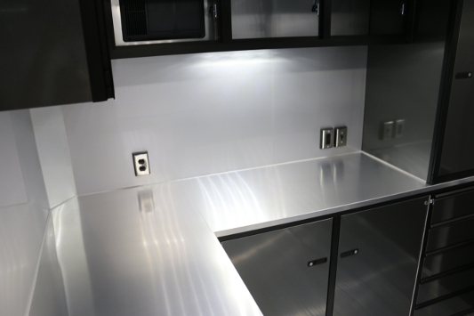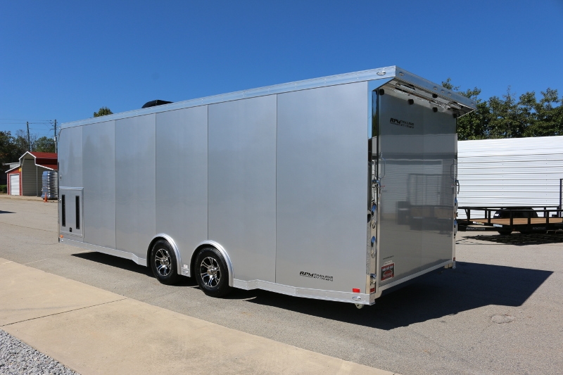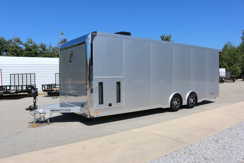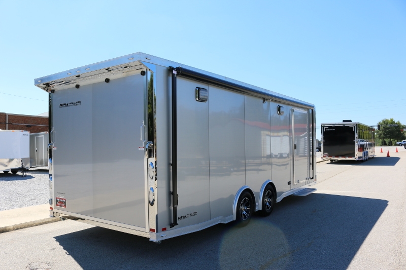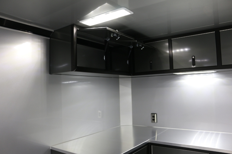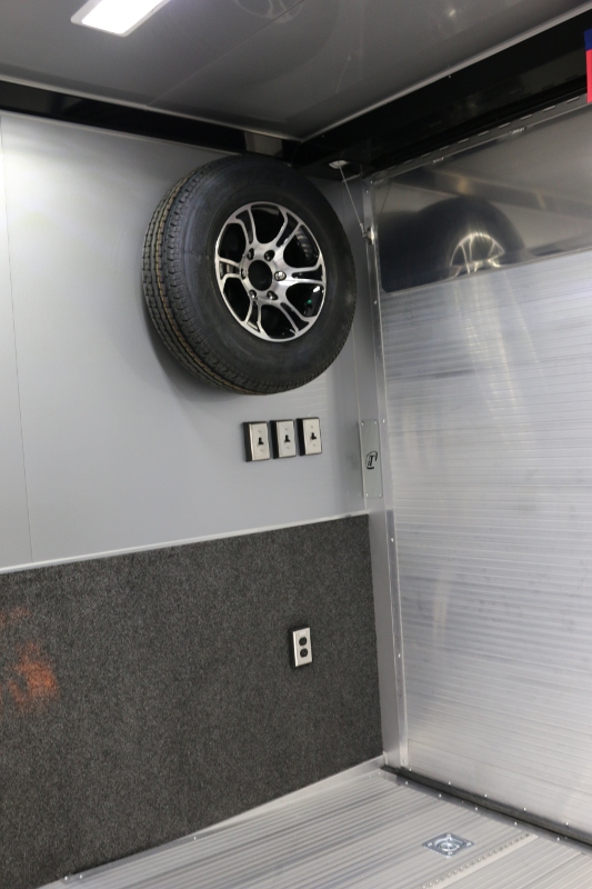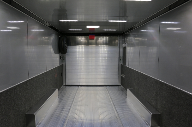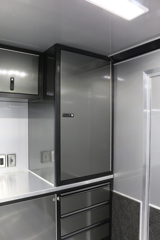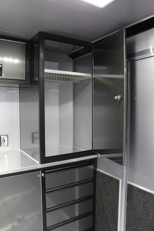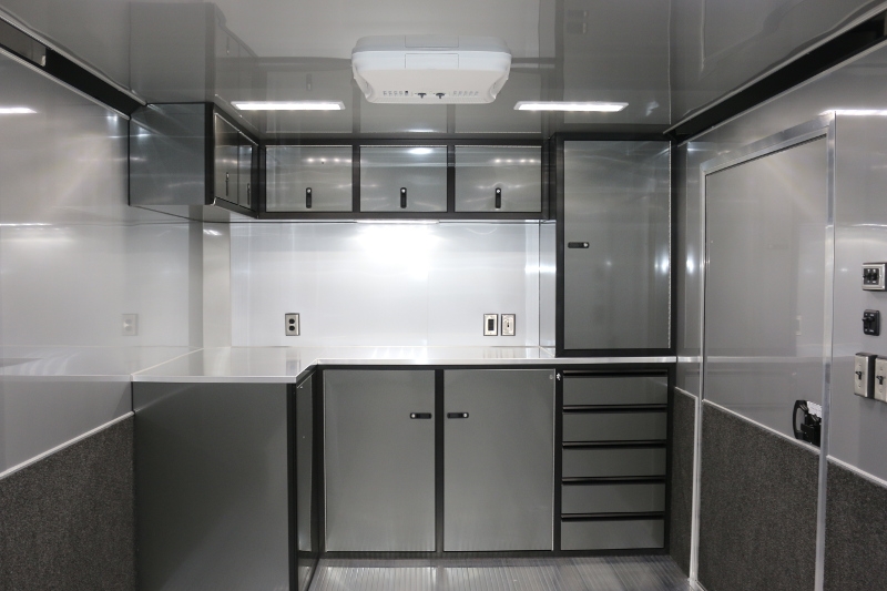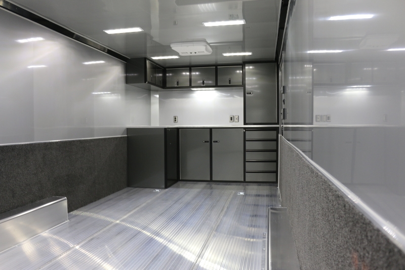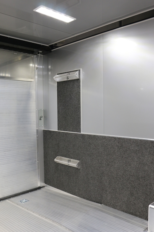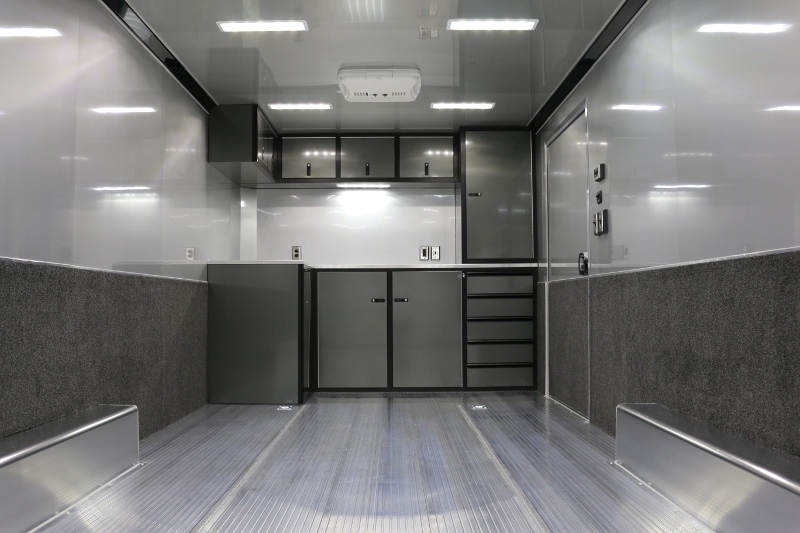 Custom 24′ All-Aluminum trailer with 5,200 lb. Axles, custom interior design including our popular Black Anodized Cabinet Trim Package, 34″ High Carpet on interior walls and more.