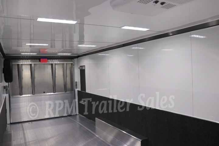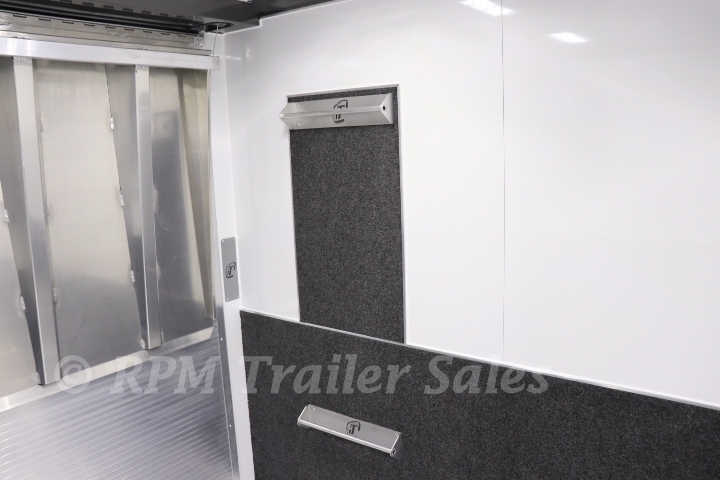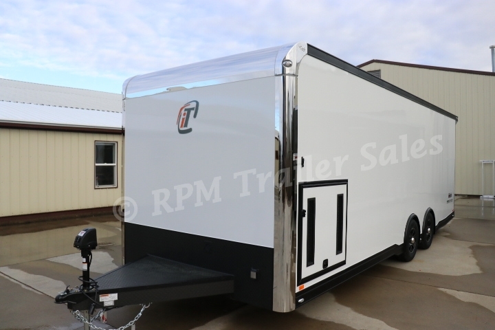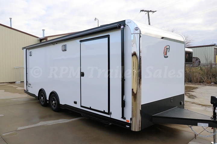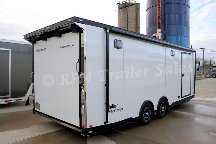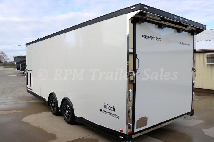 24’ inTech Aluminum Race Car Trailer for Sale with Anodized Exterior Trim Black Out Package. Pure, all-encompassing luxury no matter where the journey takes you. This 24’ Custom Aluminum Trailer has all the wow factor and more. When it comes to the ultimate aluminum car hauler, race car trailer, motorcycle trailer, or your favorite ATV Trailer every detail delivers when designed by RPM Trailer Sales. When you open the side door or rear ramp door, you will not be disappointed.