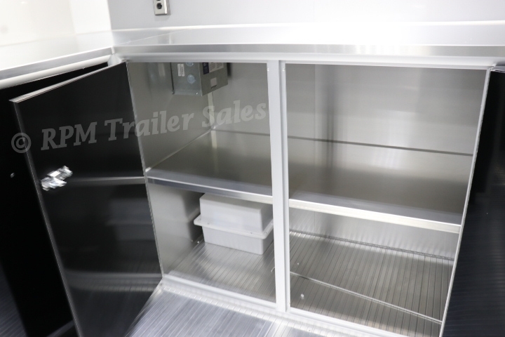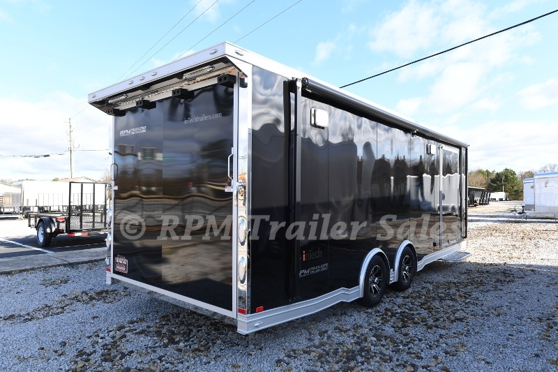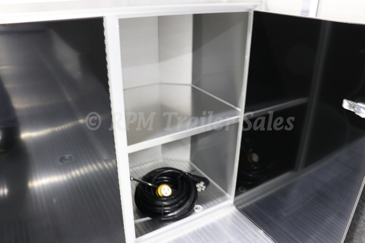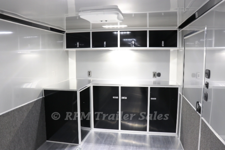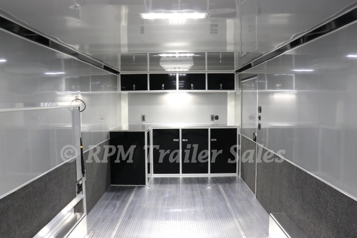 It’s an incredible 24’ Black inTech Aluminum Trailer with Full Access Escape Door. This 24’ car hauler is ready for your most prize possession. Featuring the full access escape door, getting out of your car couldn’t be any easier! The black aluminum cabinets make a bold statement inside, giving you the perfect amount of storage space for all you belonging. It includes our popular L-Base lower cabinet with generator compartment and an 8’ section of overhead cabinets.