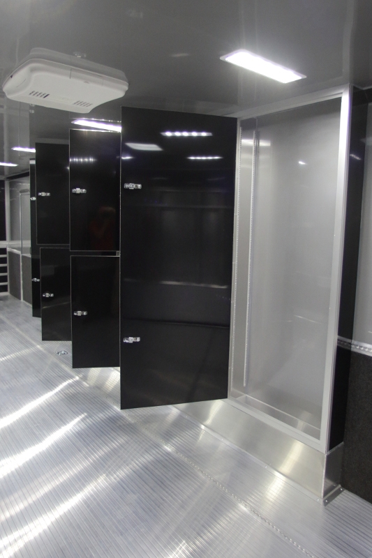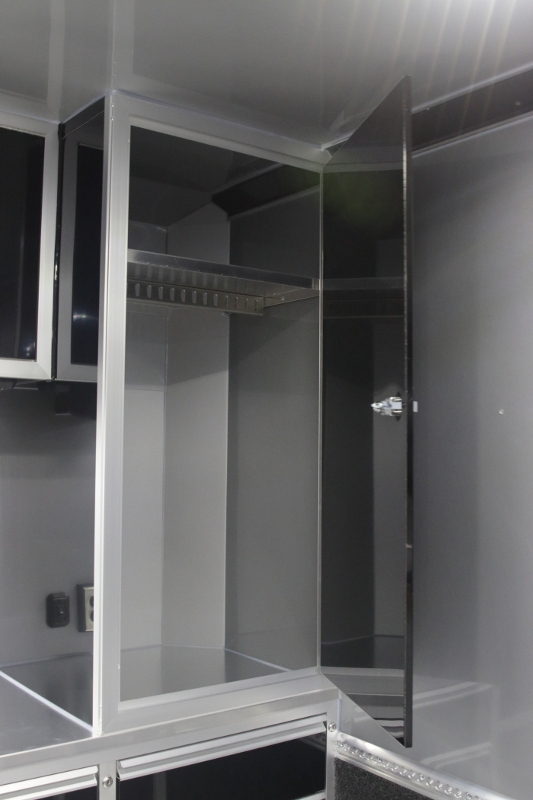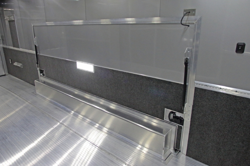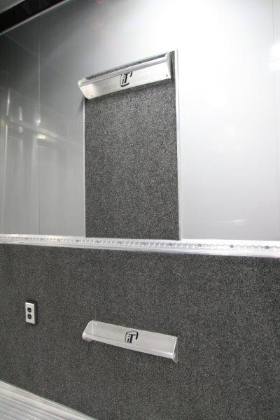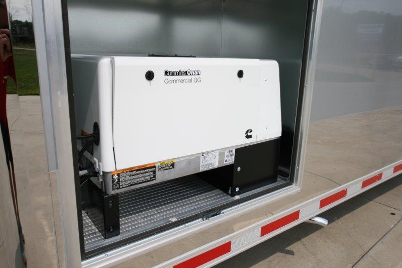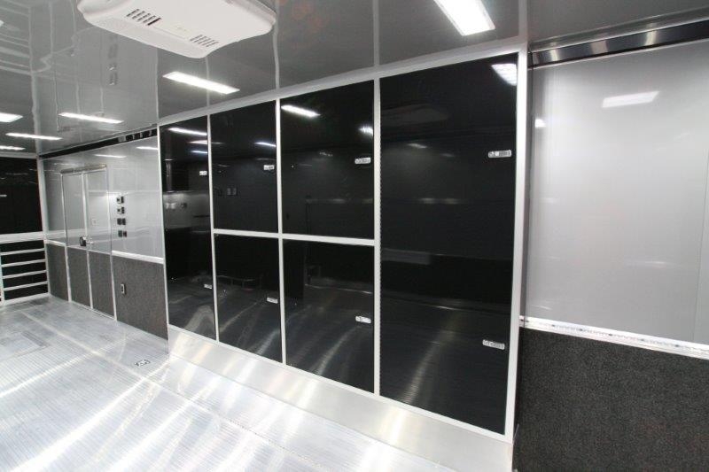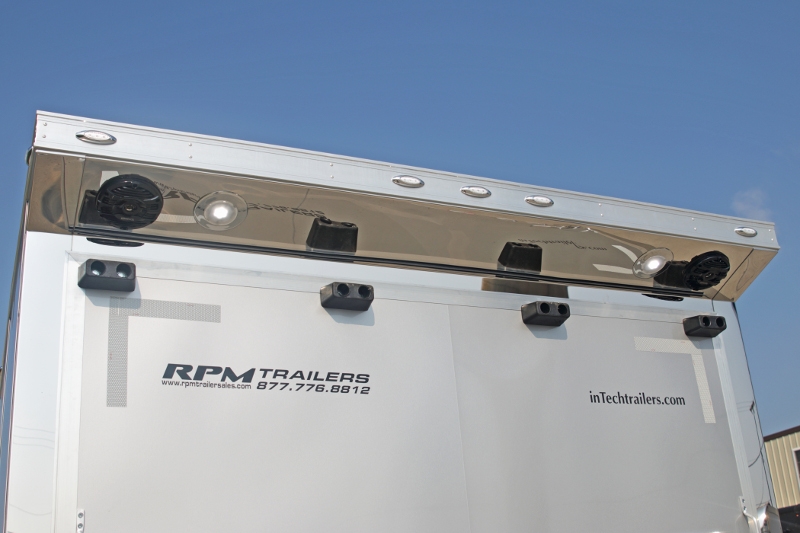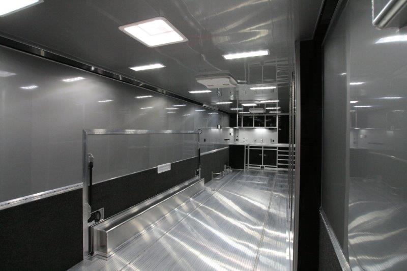 34’ incredibly packaged aluminum race car trailer. This 34′ inTech aluminum trailers has all the features the racer or auto enthusiast is looking for in a trailer. All-Aluminum Frame, All-Tube Construction, Extruded Aluminum Floor, Aluminum Interior Walls & Ceiling, Base & Overhead Cabinets, Electrical Package and a whole lot more. The onboard Onan 7KW generator supplies the power and whether it’s hot or cold outside, you’re able to create a climate controlled environment.