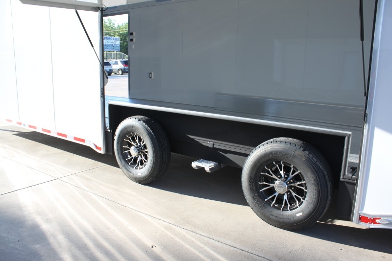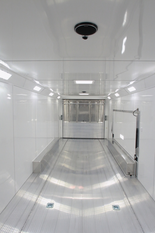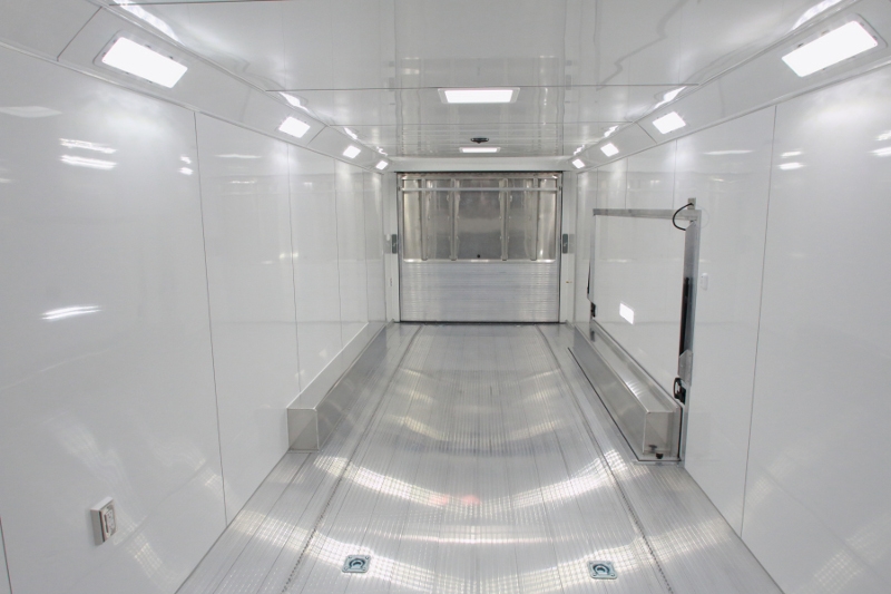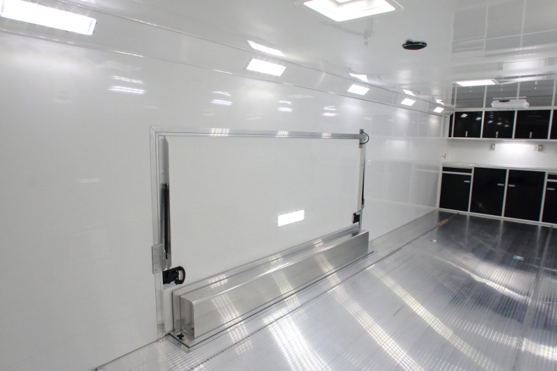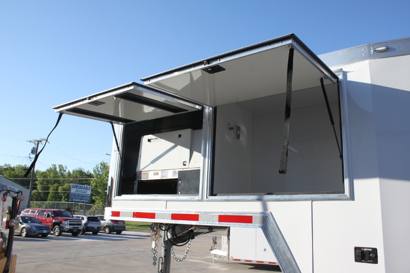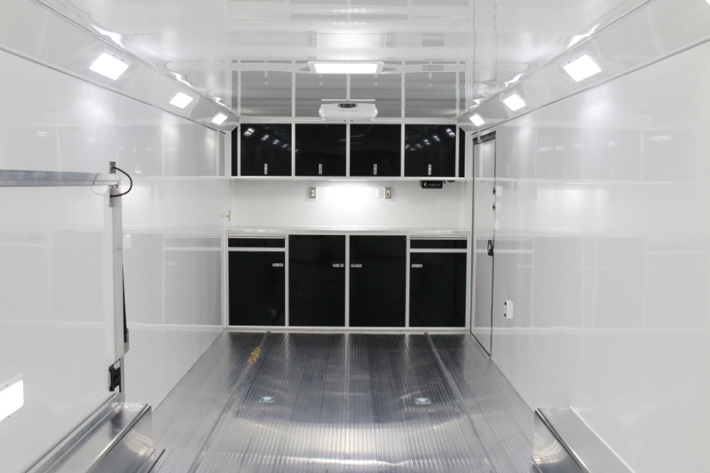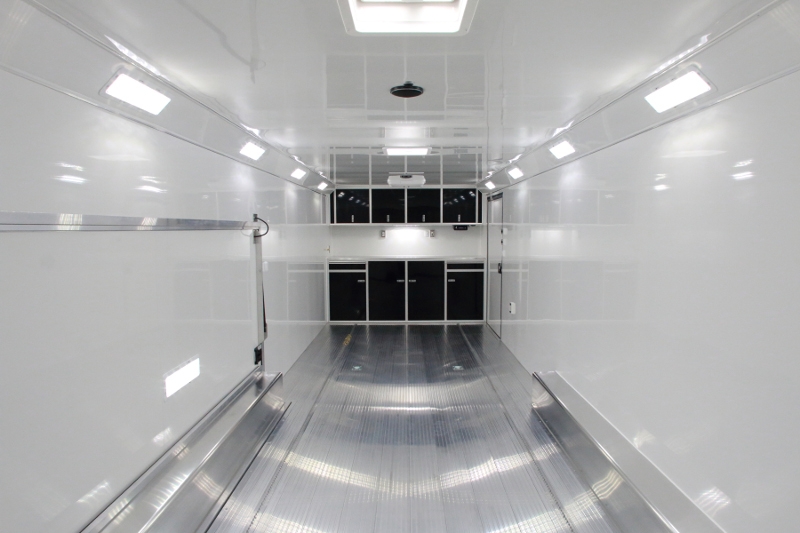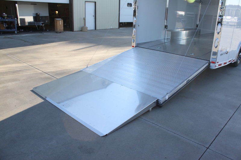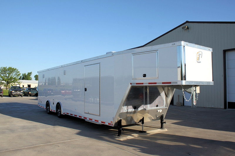 This Custom All Aluminum 38′ Race Car Trailer comes with a variety of options and special features including our popular Full Access Escape Door, 5.5KW Onan Generator Package, custom cabinet design and so much more.