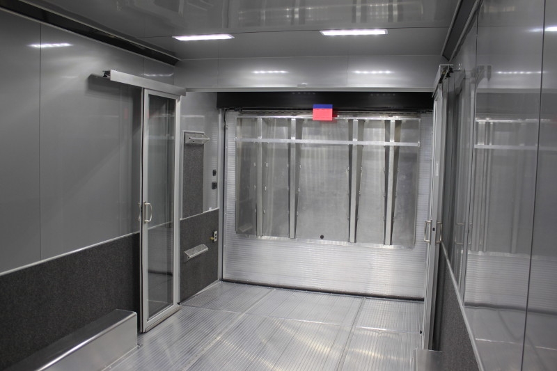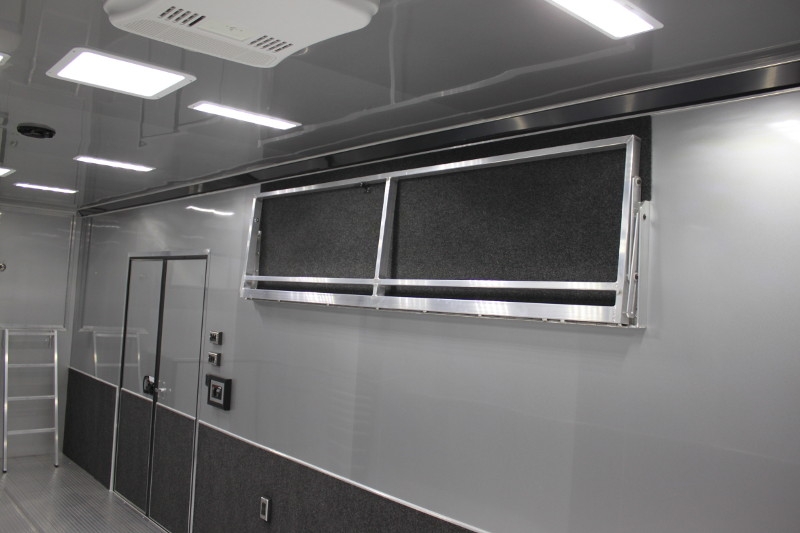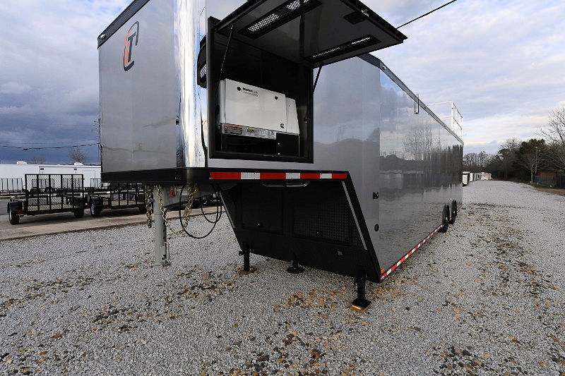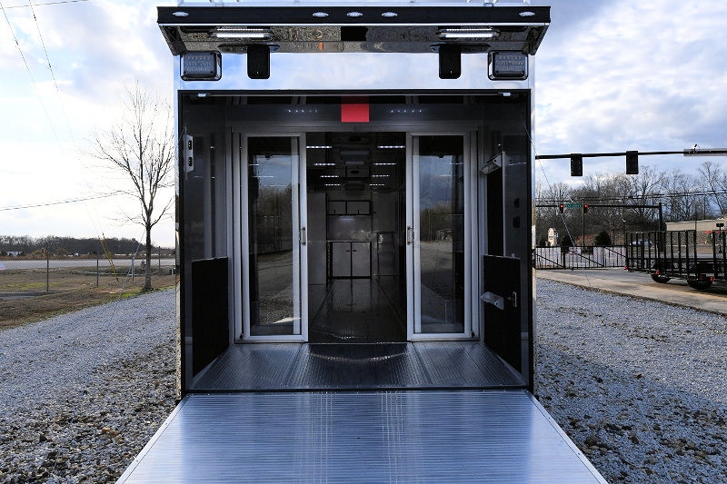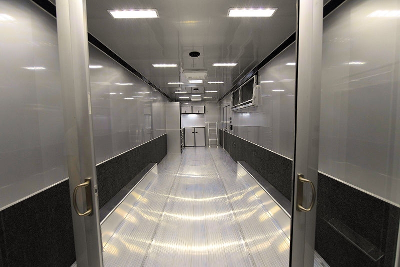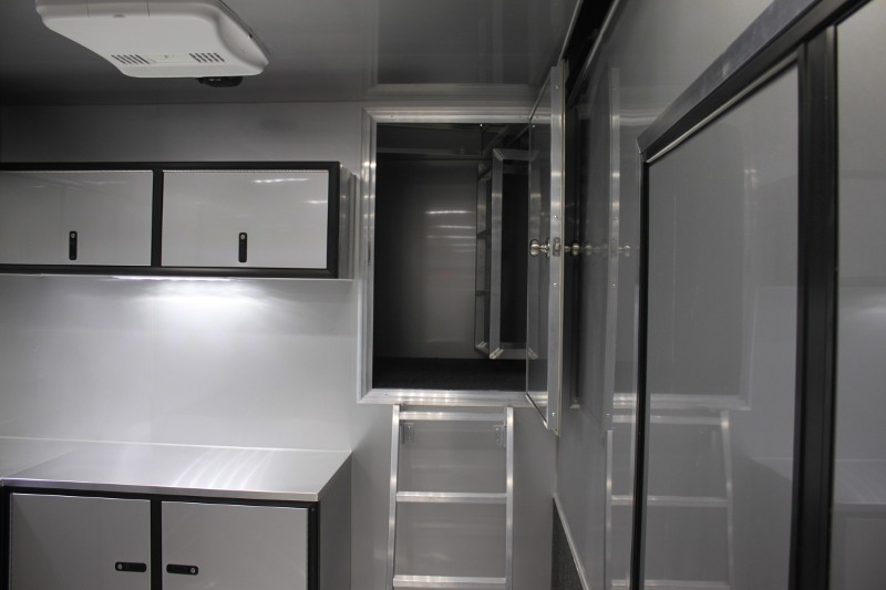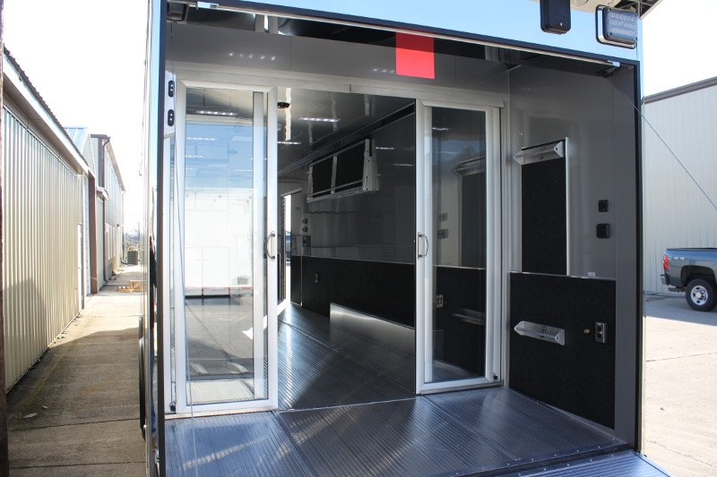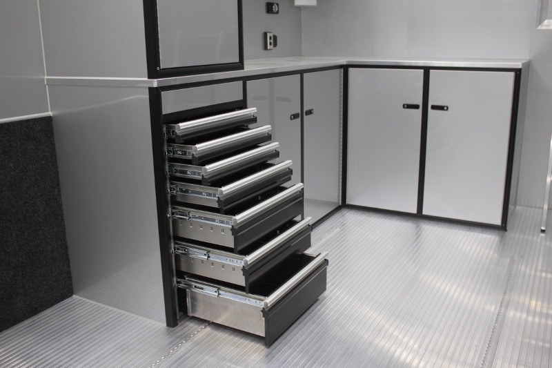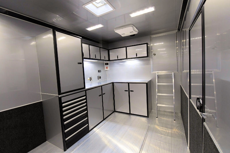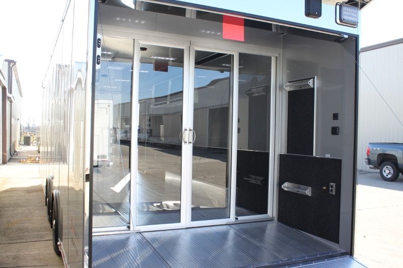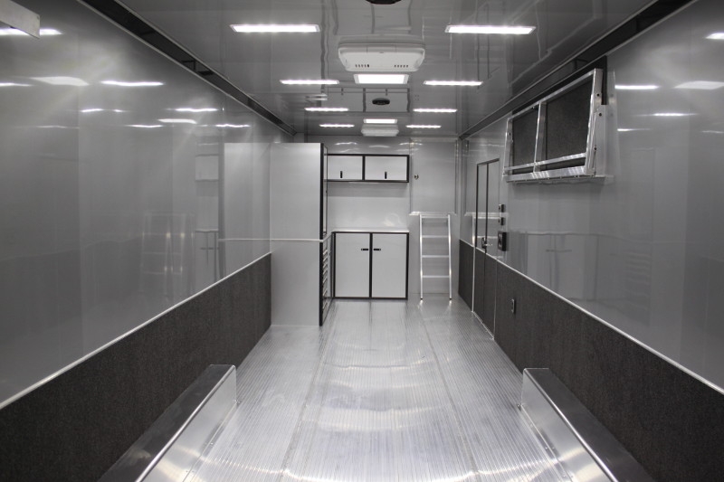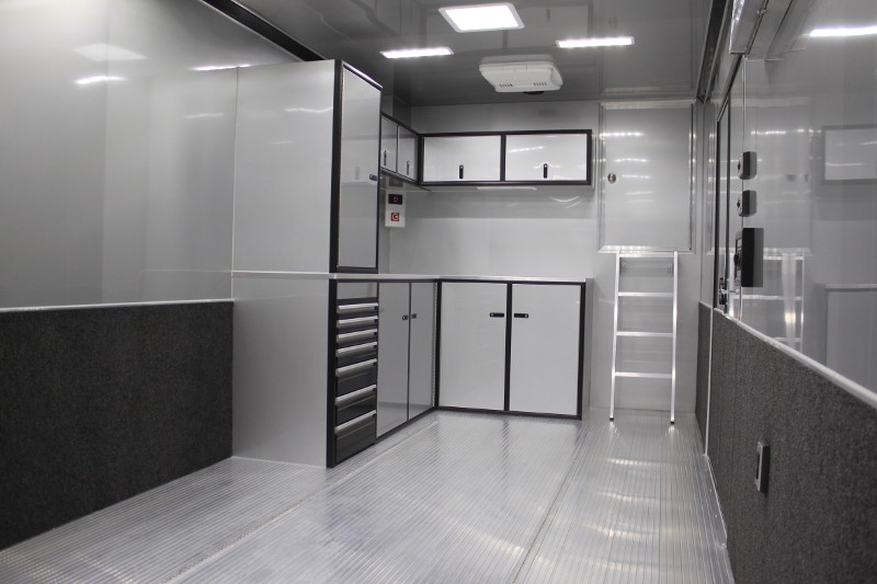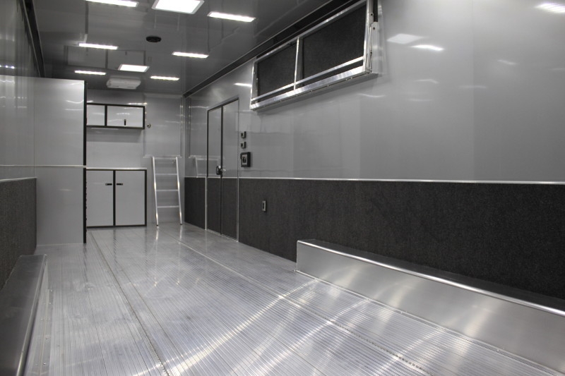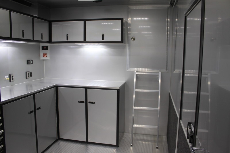 Custom 42′ inTech Aluminum Gooseneck Trailer design loaded with custom options and ready to impress! Check out the custom cabinet design, rear glass door, and so much more this amazing trailer has to offer.