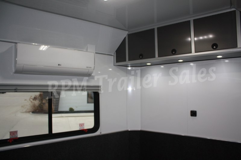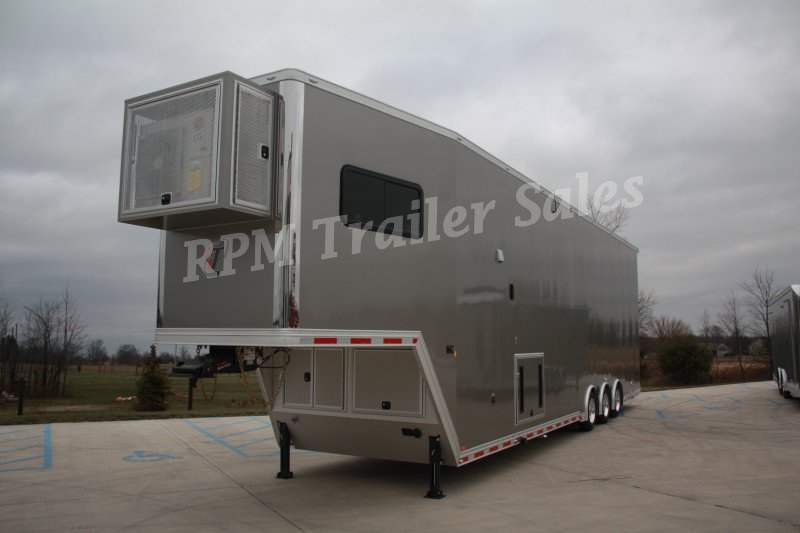 This 44’ Custom Aluminum Gooseneck Stacker Trailer comes with many great features including 12KW Onan Generator Package, Mini Split 36K Air Conditioner w/ Heat Pump, dual exterior power awnings, full bathroom package and so much more.