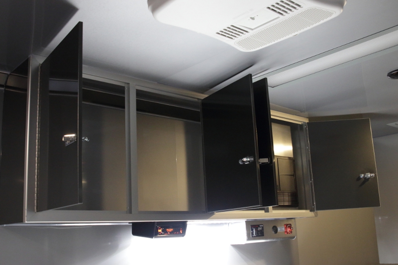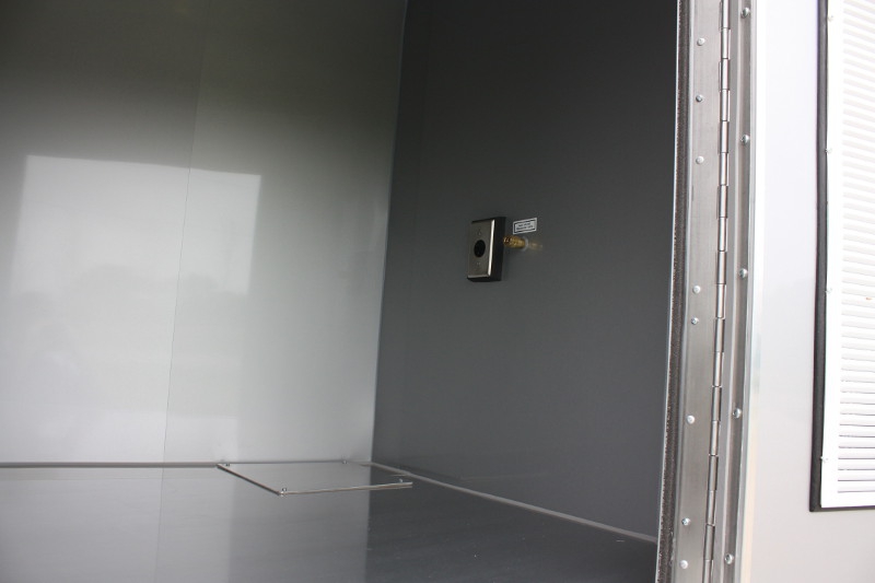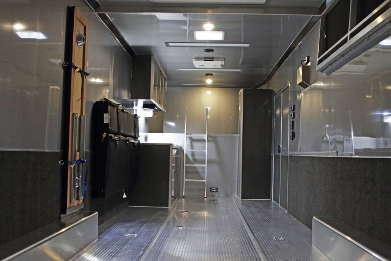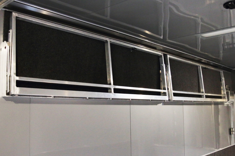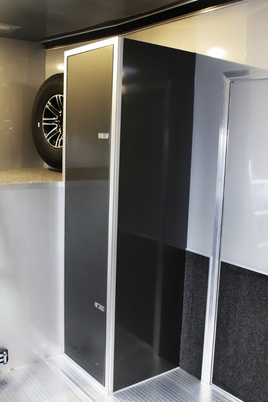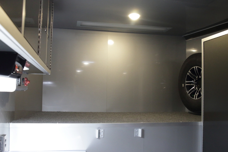 This trailer features a 97.5 Rear Ramp Door Opening, Onan generator package, 34” high carpet on the walls, fold up wall mount tire racks, heavy duty walk on roof & more!