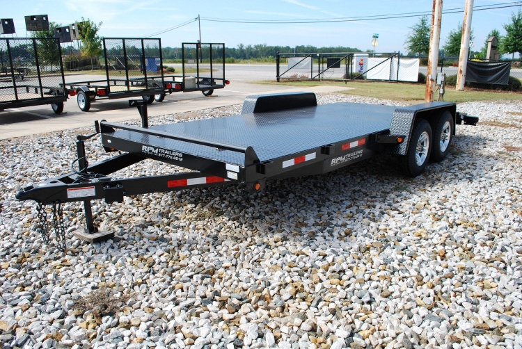 82″ x 18′ Solid Steel Deck Car Trailer 15” Tires & Wheels 2) 3500# E-Z Lube Axles Brakes on Both Axles Tread Plate Fenders 5″ Channel Frame Wrap-A-Round Tongue 2′ Dovetail Slide in Ramps with Spring Latch A- Frame Jack 10K 2 5/16″ Coupler 4) D-Ring tie downs DOT Tape Breakaway Kit Stake Pockets Sealed Wiring Harness Oval LED Tail & Stop Light in Guards LED Clearance & Marker Lights Spare Tire Mount NATM & DOT Compliant
